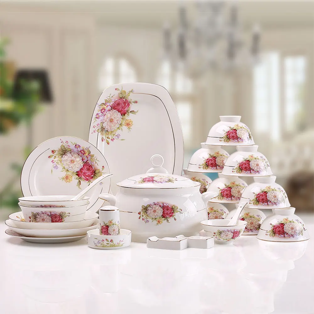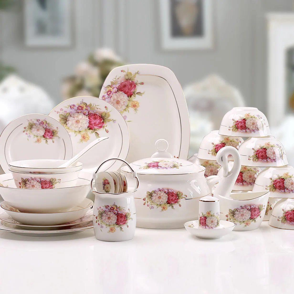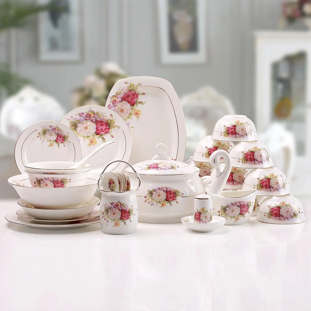 Product Name: 56 Tangshan Bone China Tableware Set, Phnom Penh, European Style, Red Peony Flower, High Foot Bowl, Square Plate